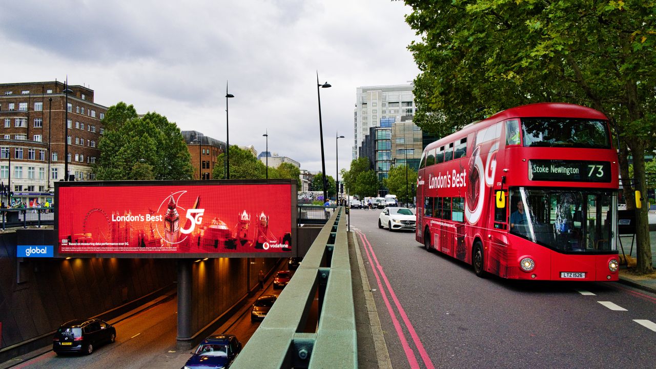 如果预算足够,则可以考虑沃达丰的做法。沃达丰发力推广5G,在伦敦使用户外掀起了一场红色的品牌风暴!以大巴为移动的品牌符号,连接大小屏在主要交通节点及节点之间实现网络化高密度传播,市民想不看这亮眼的红都难!